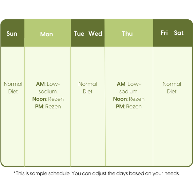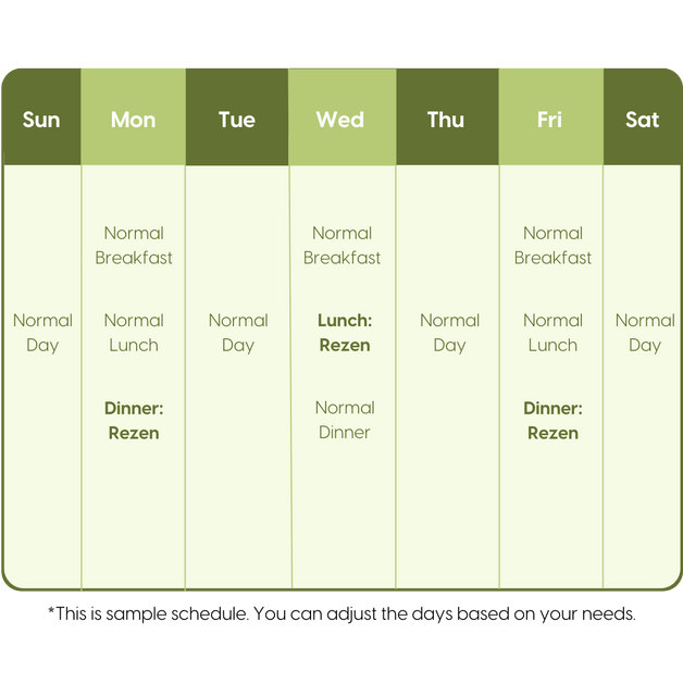 - Involves fasting with Rezen on alternating days or during specific windows each day.
